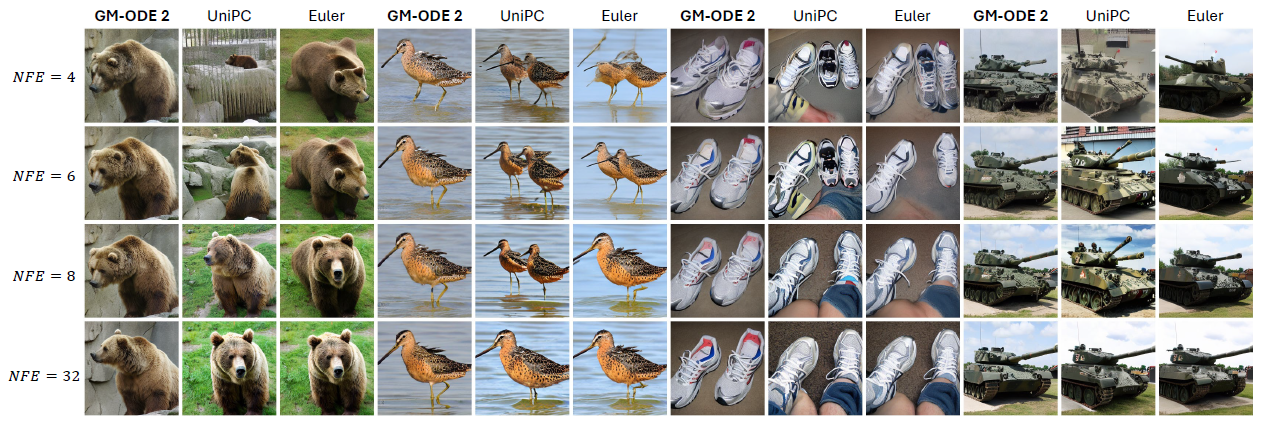 - GM‑ODE 샘플링에서는 n=⌈128/NFE⌉개의 서브‑스텝(sub‑steps)을 사용하였다.