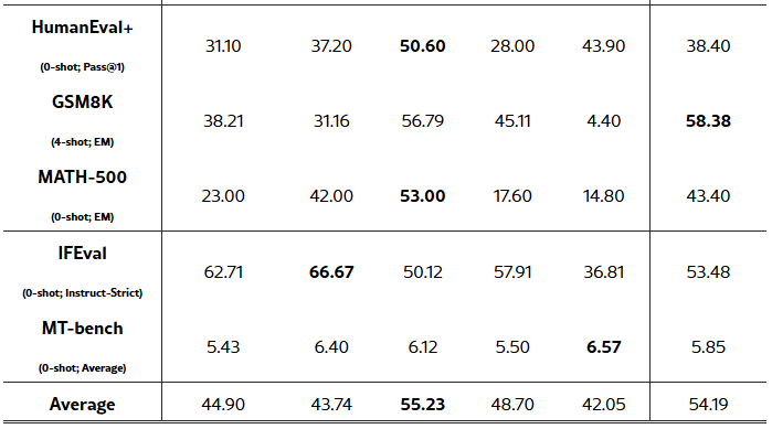 언어 이해, 추론, 수학, 코딩, 대화 등 다양한 벤치마크 전반에 걸친 종합적인 평가 결과,