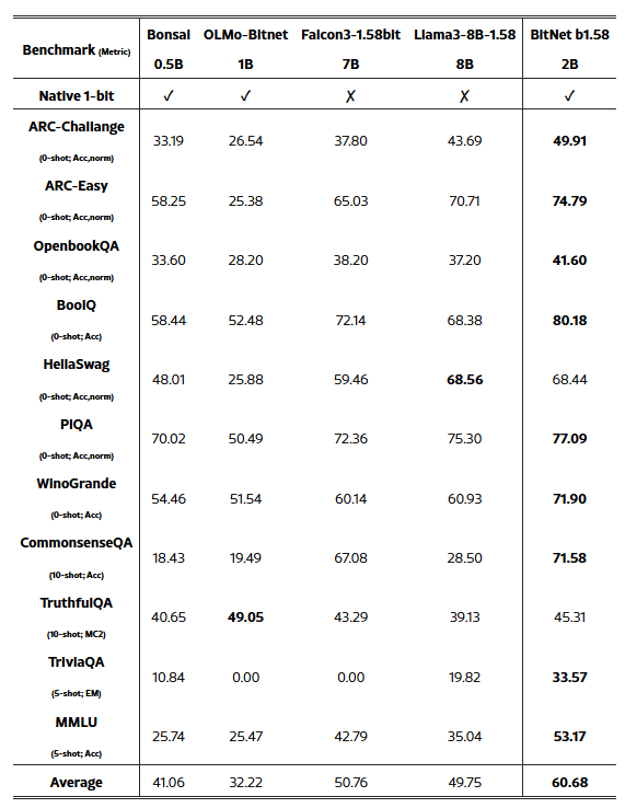 평가 결과는 BitNet b1.58 2B4T가 해당 범주의 최고 성능 모델임을 명확히 보여줍니다.