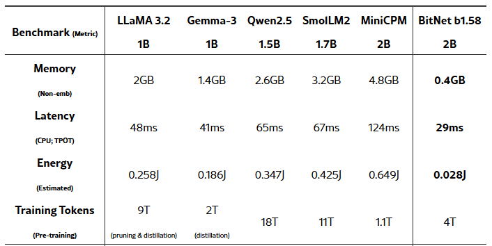 BitNet b1.58 2B4T는 파라미터 수 20억, 학습 토큰 수 4조 규모로 처음부터 학습된 최초의 오픈소스 네이티브 1비트 LLM이며,