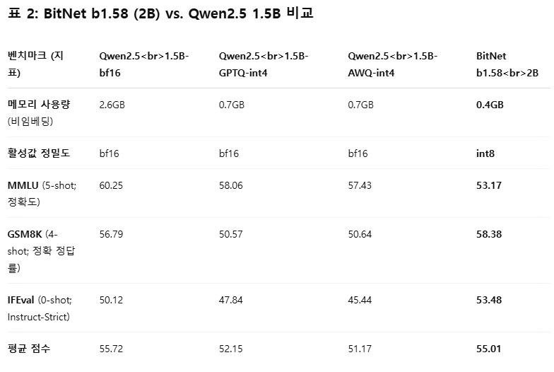 BitNet b1.58 2B4T는 1.58비트 가중치와 8비트 활성값을 사용하는 독자적인 양자화 방식(W1.58A8)을 채택하고 있으며,