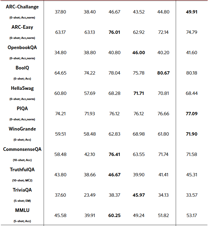 비교된 모든 1비트 모델보다 전반적으로 월등한 성능을 기록하였고, 대부분의 벤치마크에서 최고 점수를 달성했습니다.