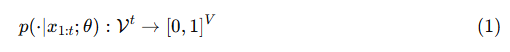로부터 다음 토큰에 대한 확률 분포를 출력하는 함수로 본다. 각 토큰 xⱼ는 어휘 집합 𝒱 = {1, …, V}의 원소다. 이 확률 분포는 가중치 θ로 파라미터화되며 다음과 같이 표현된다.