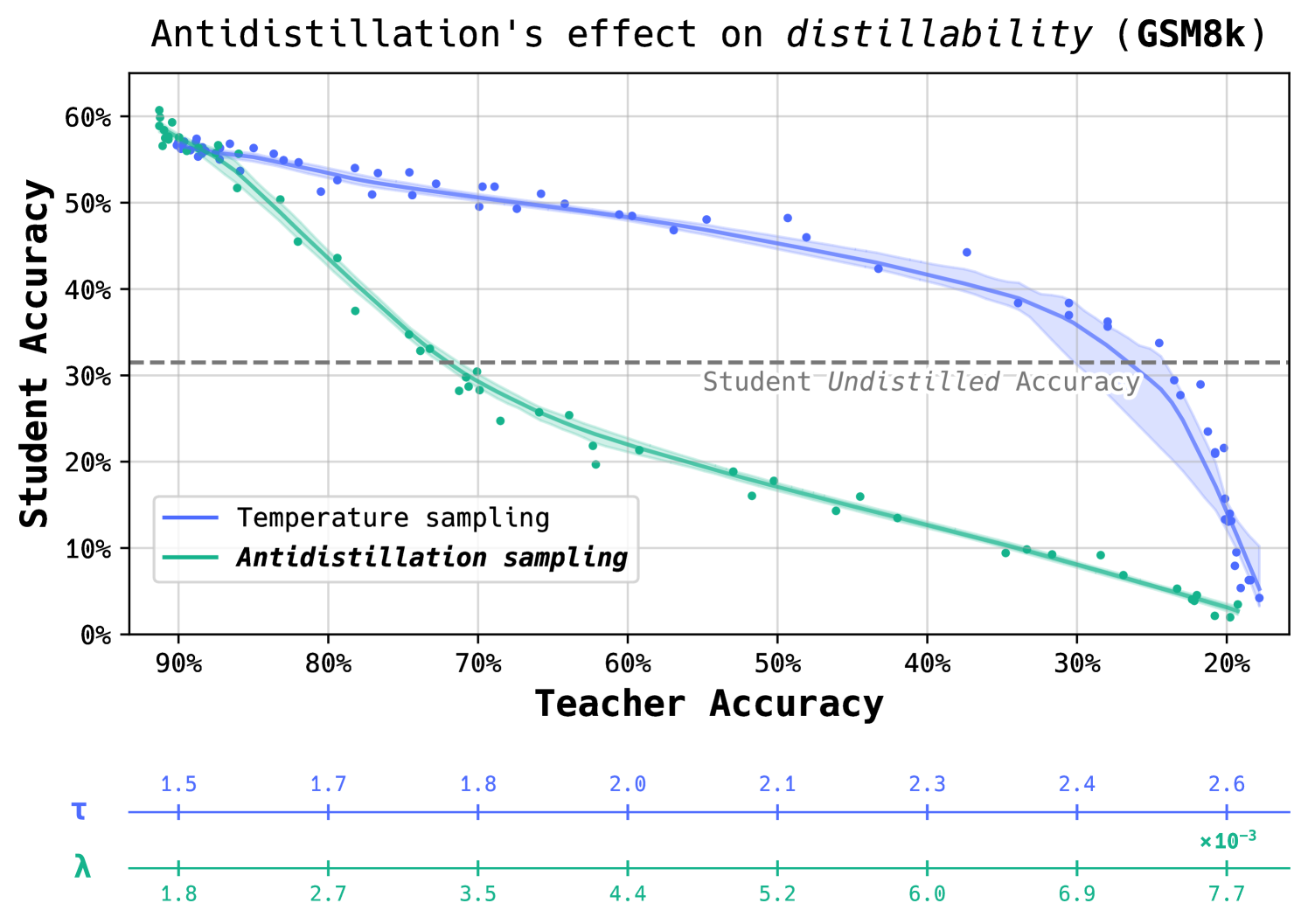 → 이 경우 학생 성능을 원본 수준 이하로 떨어뜨리려면 교사 정확도가 20%까지 떨어져야 함 - Antidistillation Sampling: 교사 모델의 정확도를 70% 수준으로 유지하면서도, 생성된 추론 과정을 통해 학생 성능을 원본 수준 이하로 낮출 수 있음