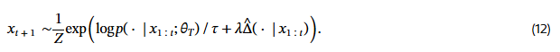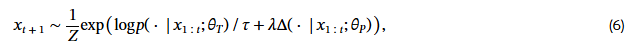 이제 교사 모델의 원래 로그 확률 log p(xₜ₊₁ | x₁:ₜ; θₜ)에 Δ(xₜ₊₁ | x₁:ₜ)에 비례하는 패널티를 추가하여, 조정된 샘플링 분포를 다음과 같이 정의한다: