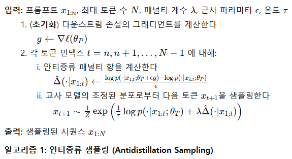 프롬프트 x₁:ₜ가 주어졌을 때, 새로운 토큰 xₜ₊₁을 생성하는 안티증류 샘플링 절차는 다음과 같다: