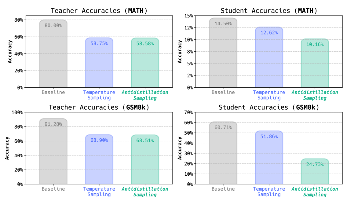 즉, 교사 모델의 정확도를 고정한 상태에서, 안티증류 샘플링으로 생성된 추론 과정을 기반으로 학습한 학생 모델은, temperature 샘플링으로 생성된 추론 과정을 사용한 모델에 비해 현저히 낮은 성능을 보인다.