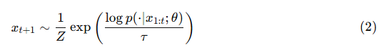 특히 τ = 0일 경우는 greedy 샘플링에 해당하며, 이 경우 다음 토큰 xₜ₊₁는 log 확률이 가장 큰 토큰으로 결정된다(즉, 결정적 선택).