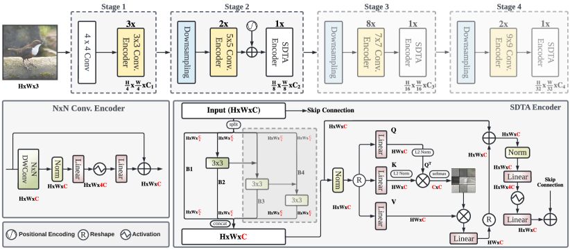- 2~4단계: 각 단계의 시작 부분에서 2×2 스트라이드 합성곱으로 다운샘플링하며, 이어서 N×N 합성곱과 SDTA(Split Depth-wise Transpose Attention) 인코더를 사용합니다.