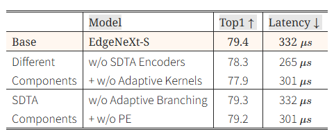 표 7: EdgeNeXt와 SDTA 인코더의 다양한 구성 요소에 대한 Ablation 분석 결과