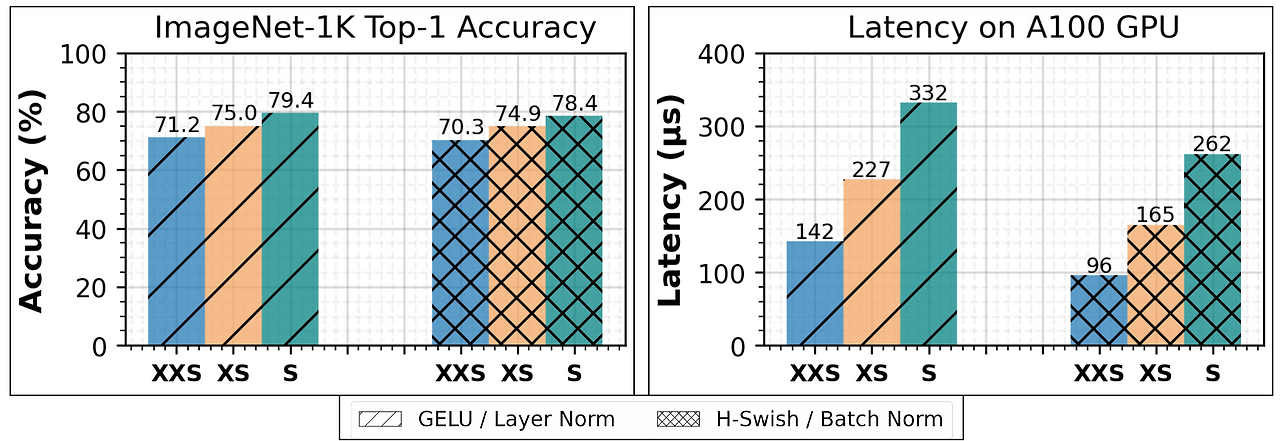 GELU와 LayerNorm 대신 Hard-Swish와 BatchNorm을 사용하면, 정확도는 일부 손해를 보지만, 지연 시간은 크게 향상됨을 나타냅니다.