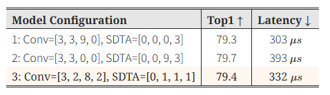 각 단계의 마지막 블록에 하나씩만 SDTA 인코더를 사용하는 것이 정확도와 추론 지연 시간 사이에서 가장 좋은 트레이드오프를 달성합니다.