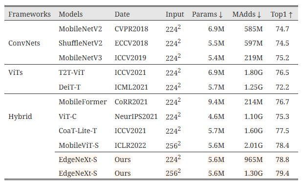 EdgeNeXt는 더 적은 파라미터 수와 MAdds로 최근 ViT 계열 모델들보다 더 나은 성능을 ImageNet-1K에서 보여줍니다.