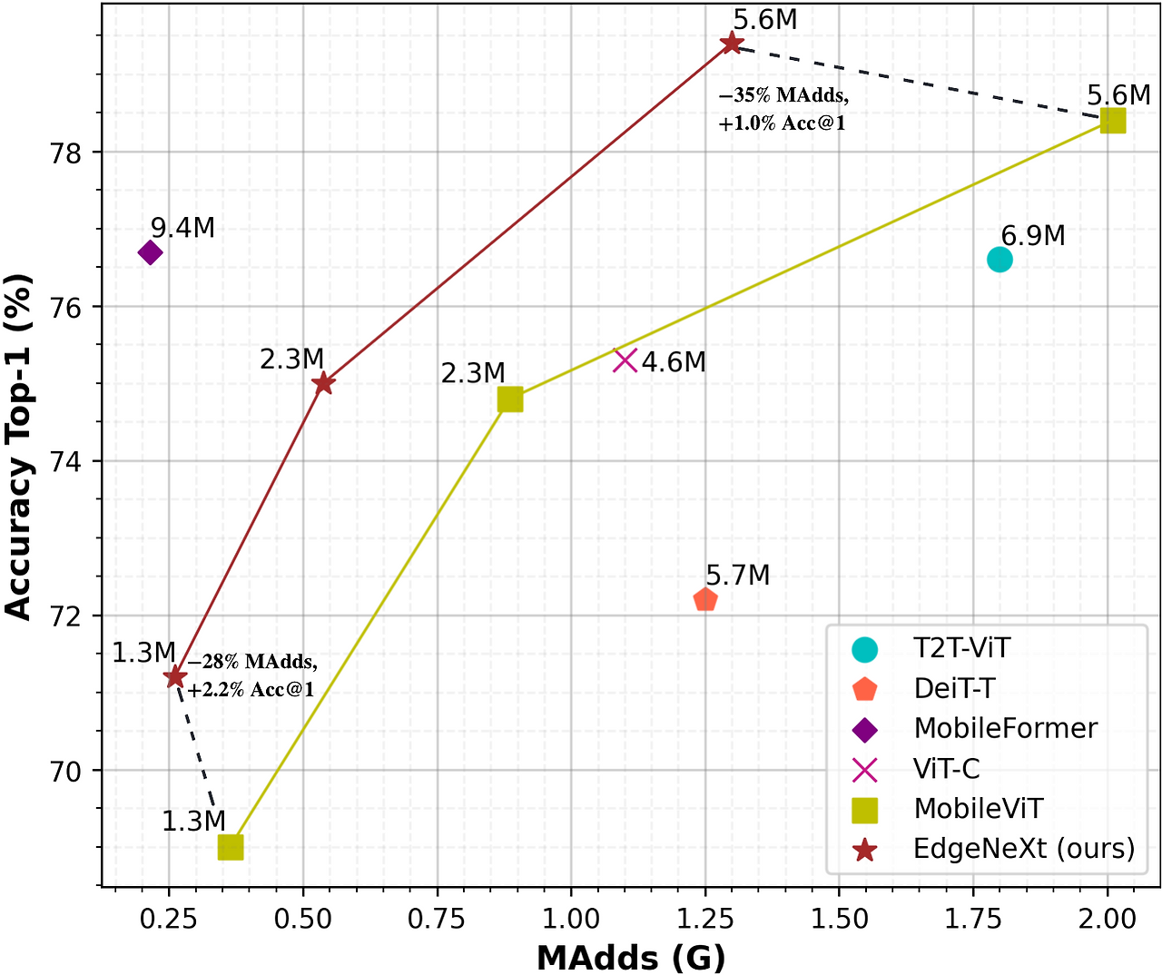 x축은 곱셈-덧셈(MAdd) 연산량을, y축은 ImageNet-1K Top-1 분류 정확도를 나타냅니다. 각 점에는 해당 모델의 파라미터 수가 표시되어 있습니다.