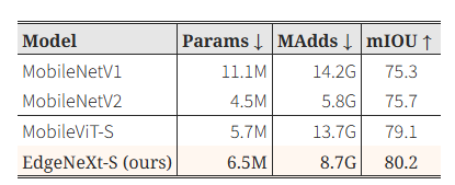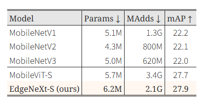 - 객체 탐지 및 시맨틱 분할 과제에서도, EdgeNeXt는 기존에 발표된 모든 경량 모델들과 비교해 더 적은 MAdds와 비슷한 파라미터 수로 더 높은 mAP(탐지 성능) 및 mIOU(분할 성능) 를 달성했습니다.