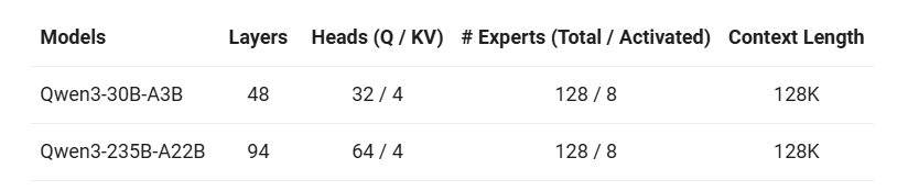 우리는 두 개의 MoE(Mixture of Experts) 모델을 오픈 웨이트(open-weight)로 공개합니다. 하나는 총 2,350억 개의 파라미터와 활성화된 220억 개의 파라미터를 가진 대형 모델 Qwen3-235B-A22B, 다른 하나는 총 300억 개의 파라미터와 활성화된 30억 개의 파라미터를 가진 소형 MoE 모델 Qwen3-30B-A3B입니다.