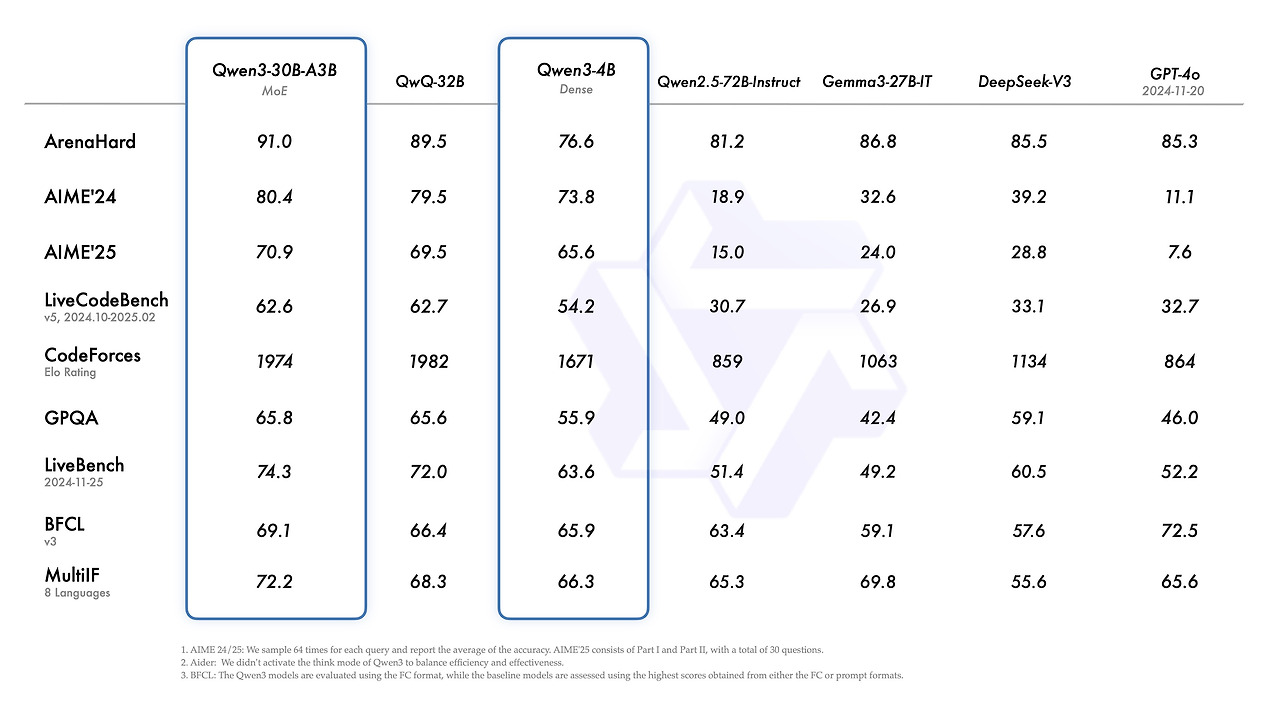 추가로, Qwen3-32B, Qwen3-14B, Qwen3-8B, Qwen3-4B, Qwen3-1.7B, Qwen3-0.6B 등 총 6개의 덴스(dense) 모델도 Apache 2.0 라이선스 하에 오픈 웨이트로 공개됩니다.