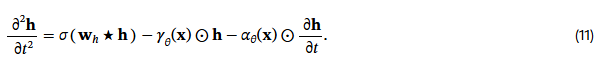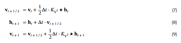 구체적으로, 우리는 Verlet 적분(Verlet integration)을 사용하여 파동 방정식을 정확하게 수치적으로 적분하는 RNN 구조를 구성하며, 이에 따라 은닉 상태 𝐡와 연관된 속도 상태 𝐯(coupled velocity state)에 대해 다음과 같은 업데이트 식을 얻게 된다: