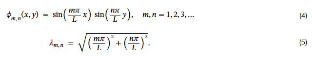 변의 길이가 L인 정사각형 드럼의 경우, 위에서 설명한 경계값 문제(boundary value problem)는 잘 알려진 단순한 해를 갖는다(Bérard & Helffer, 2014).