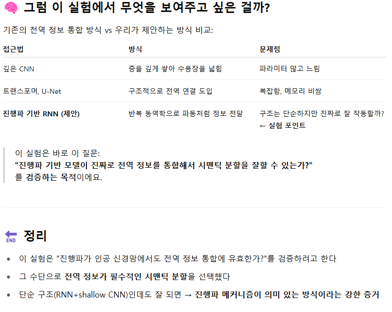 논문의 두 번째 부분에서는 이 직관을 바탕으로, 초기 인코더와 순환 연결이 모두 국지적 수용장 제약을 가진 합성곱 순환 신경망(conv-RNN)을 구축하고, 이를 보다 복잡한 전역 정보 처리 과제(의미 분할 등)에 적용해본다. 우리는 각 뉴런의 순환 활성화 시계열을 학습 중 주요 표현(primary representation)으로 사용하여(Figure 1 도식 참조), 이 모델이 지역적으로 제약된 다른 모델보다 우수한 성능을 내고, 일부 깊은 합성곱 모델(U-Net 등)과도 경쟁할 수 있으며, 학습이 더 안정적으로 수렴함을 보여준다. 결국 이는 진행파 기반 정보 통합이 기존 딥러닝 기반 공간 통합 기술에 대한 효율적이고 안정적인 대안이 될 수 있음을 시사한다.