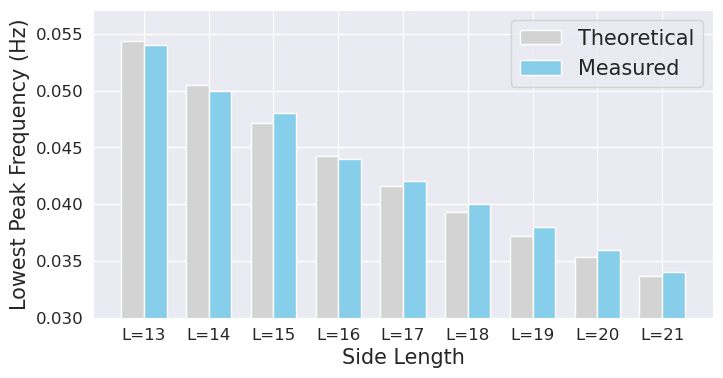 변의 길이 L이 다른 정사각형 드럼 헤드에 대해, 이론적으로 예측된 기본 주파수(Hz 단위, cycles/sec)와, 정사각형 입력을 기반으로 순환 동역학을 결정하는 파동 기반 RNN(wave-based RNN)에서 측정된 가장 낮은 피크 주파수를 비교한 결과를 나타낸다.