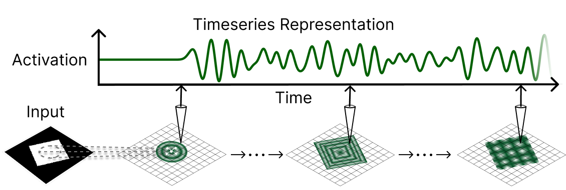 시각 자극은 뉴런 격자(lattice)의 초기 조건을 설정하고, 각 뉴런의 국지적 수용장(local receptive field) 및 순환 연결(recurrent connectivity)에 기반한 반응 특성을 정의한다. 이 초기 조건은 순환 파동 동역학(recurrent wave dynamics)에 따라 시간이 지남에 따라 진화하며, 각 뉴런에서 생성된 시계열(timeseries)은 시각 자극에 대한 전역적으로 통합된 표현(global integrated representation)이 된다.