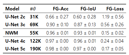 가장 인상적인 결과로, 표 2(Table 2)에서는 54K 파라미터를 가진 NWM 모델이, 30K 및 68K 파라미터를 가진 U-Net 모델보다 더 나은 성능을 보였다. 이는 NWM이 skip connection 없이, 국지 연결만으로 이루어졌다는 점에서 특히 주목할 만하다. 또한, NWM은 122K 및 190K 파라미터를 가진 U-Net 모델보다도 약간 낮은 성능만을 보이며, 비교적 작은 규모로도 경쟁력 있는 성능을 유지하고 있다. 또한 NWM은 모든 모델 중에서 foreground loss가 가장 낮았으며, 이는 다른 모델에 비해 예측(예: background)에 대한 신뢰(confidence)가 높아서일 가능성이 있다. 마찬가지로, NWM은 분산이 매우 낮아, 동급 U-Net 모델보다 훨씬 더 안정적인 학습 과정을 보였다는 점도 확인할 수 있다.