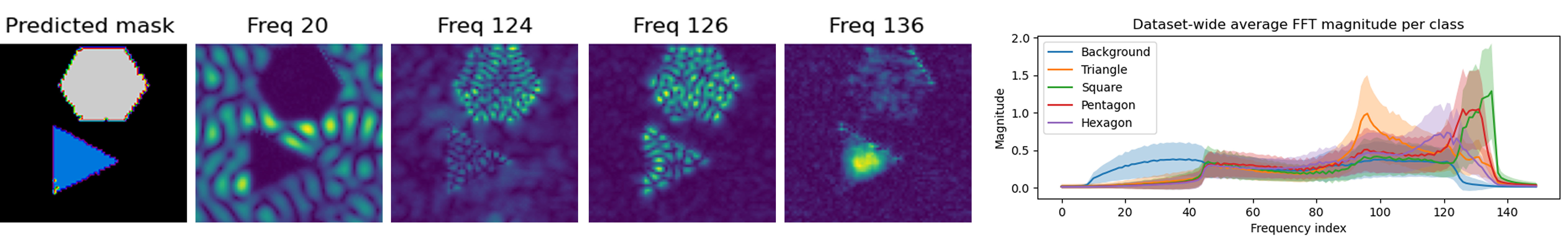 다각형 이미지에서 변의 개수에 따라 픽셀을 분류하도록 학습된 국지 인코더(local encoder)와 순환 연결(recurrent connection)만을 사용하는 진동자 모델(oscillator model, NWM)의 은닉 상태 시퀀스를 보여준다. 모델은 도형의 내부와 외부에 서로 다른 고유 진동수(natural frequency)를 사용함으로써 부드러운 경계(soft boundary)를 형성하고, 이를 통해 파동 반사(reflection)를 유도하여, 도형의 형태에 따라 상이한 내부 동역학을 생성하는 법을 학습한 것을 볼 수 있다.
