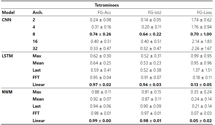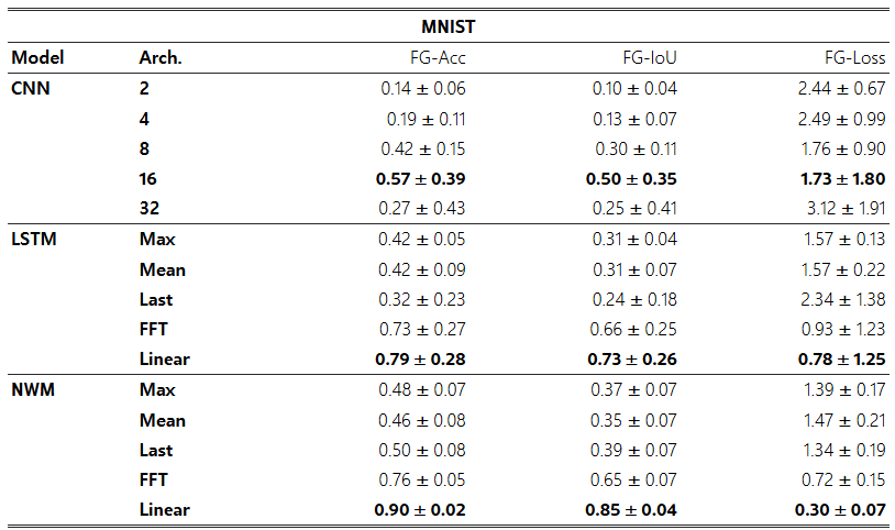 표 1: 시간 시계열 기반 readout을 사용하는 국지 제약 순환 모델(locally constrained recurrent models)은, 전역 정보가 필요한 픽셀 단위 시맨틱 분할(semantic segmentation) 작업을 성공적으로 수행할 수 있다. 가장 낮은 foreground loss를 기록한 모델은 굵게 표시되어 있다. Arch (architecture)는 CNN 계층 수와, LSTM 및 NWM에 대한 readout 방식의 유형을 의미한다. 결과는 10개의 무작위 시드로 실험한 평균 ± 표준편차(mean ± std) 형식으로 표기되어 있다.