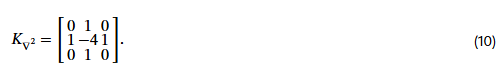 또한 K_∇² 는 2차원에서 이산 라플라시안 연산자(discrete Laplacian operator)를 표현하는 5점 스텐실(five-point stencil)을 나타낸다: