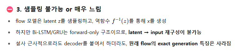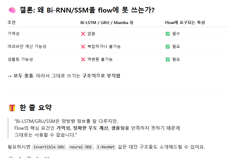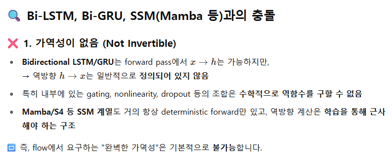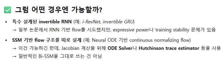 - 대부분의 Bi-LSTM, Bi-GRU, Bi-Mamba 등은 일반적으로 가역(invertible) 하지 않음.