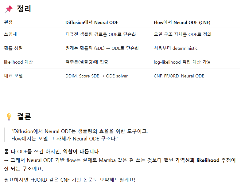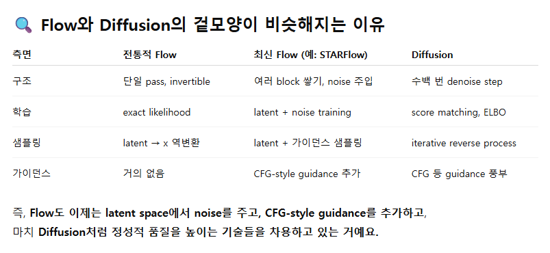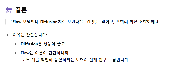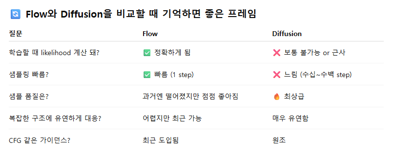 - Flow Matching은 변분 학습 목적(variational training objective)을 공유하면서 디퓨전 모델과 더 유사한 방향으로 정렬되어 있습니다.