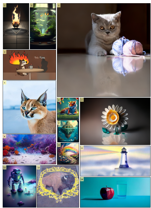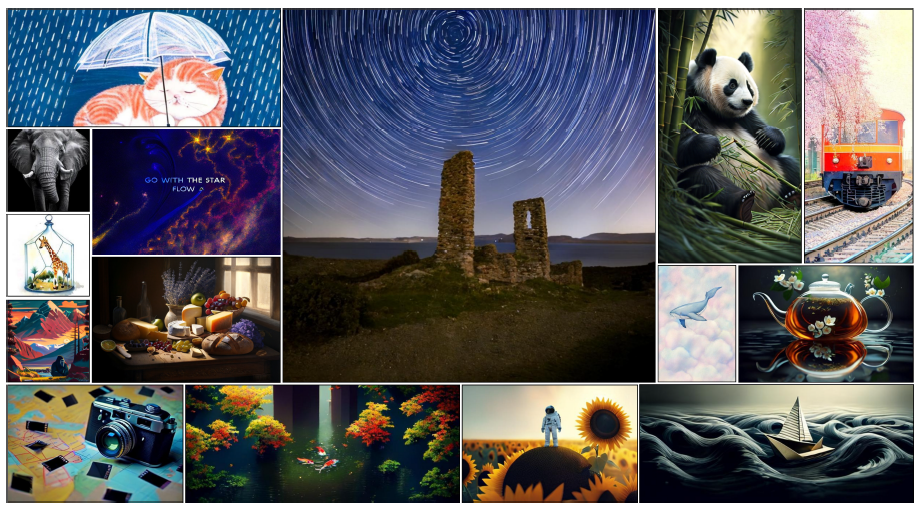 그림 1: 다양한 종횡비로 생성된 고해상도 텍스트 조건 샘플들. 모두 3.8B 파라미터 규모의 STARFlow 모델에서 생성되었으며, 시각화의 편의를 위해 해상도가 조정되어 있음.