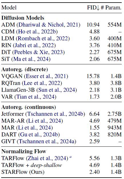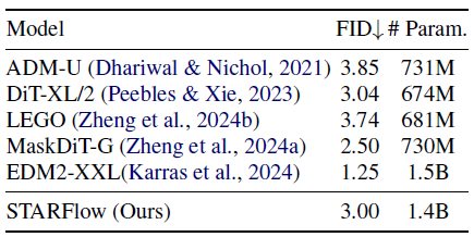 우리는 클래스 조건 ImageNet-256에서 STARFlow의 성능을 벤치마크하고, 이산(discrete) 및 연속(continuous) 영역 모두에서의 diffusion 모델과 autoregressive 모델과 비교를 수행했습니다 (표 1).