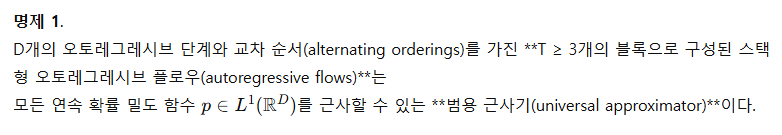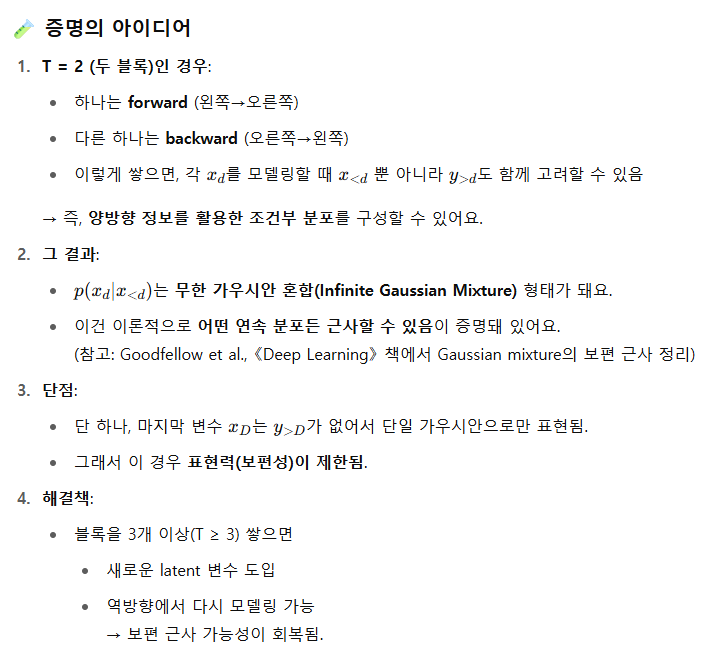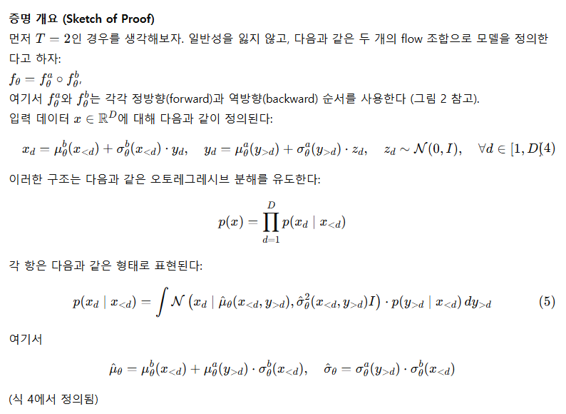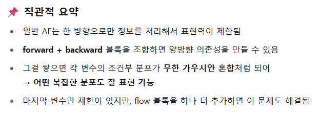 2. Autoregressive Flow는 가역성과 우도 계산을 보장하면서도 양방향 구조를 흉내낼 수 있음