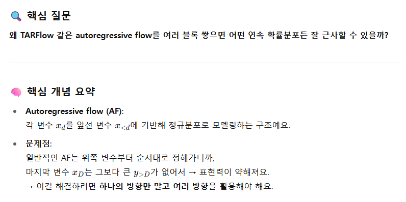 TARFlow처럼 Transformer 기반 autoregressive 구조를 스택으로 쌓는 것이 가장 실용적인 해법"입니다.