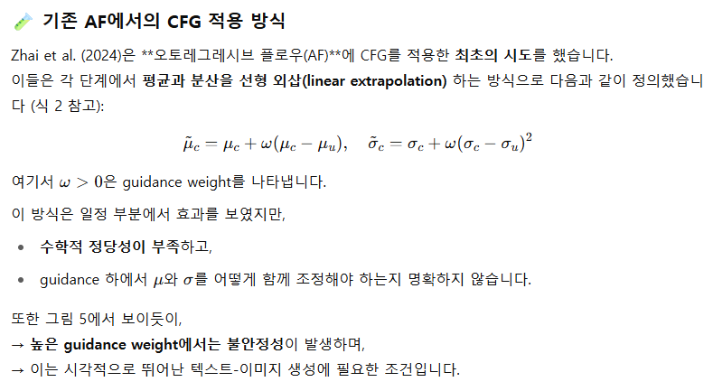 이 논문에서는 또 다른 모델링 접근 방식인 정규화 흐름(Normalizing Flows, NFs)(Rezende & Mohamed, 2015; Dinh et al., 2016)에 주목합니다. 이는 우도 기반(likelihood-based) 생성 모델 계열로, 최근 생성형 AI의 급류 속에서는 상대적으로 적은 관심을 받아왔습니다. 우리는 먼저 강력한 Transformer 아키텍처와 오토레그레시브 흐름(Autoregressive Flows, AFs)(Kingma et al., 2016; Papamakarios et al., 2017)을 결합한 최근 모델인 TARFlow(Zhai et al., 2024)를 분석하는 데서 출발합니다. TARFlow는 정규화 흐름(NF)이 유효한 모델링 프레임워크임을 보여주는 유망한 결과를 제시하지만, 이것이 확산 모델이나 이산 오토레그레시브 모델들과 비교해 확장 가능한 방법으로 작동할 수 있는지는 아직 불분명합니다. 이를 위해 우리는 STARFlow라는 생성 모델 계열을 제안합니다. 이 모델은 정규화 흐름 기반 모델이 고해상도 및 대규모 이미지 모델링에도 성공적으로 일반화될 수 있음을 최초로 입증합니다. 우리는 먼저 다중 블록 AF가 연속 분포를 모델링함에 있어 보편성(universality)을 지닌다는 이론적 통찰을 제공하며, 이를 기반으로 새로운 Deep–Shallow 아키텍처를 제안합니다. 실험 결과, 플로우 개수와 각 플로우에 할당된 Transformer의 깊이 및 너비와 같은 아키텍처 구성은 모델 성능에 결정적인 역할을 하는 것으로 나타났습니다. TARFlow에서는 모든 플로우에 균등한 깊이를 배분했지만, 우리는 대부분의 파라미터를 첫 번째 AF 블록(사전 분포에 가장 가까운)에 집중시키고, 이후 몇 개의 얕지만 의미 있는 블록을 추가하는 비균등 구조(skewed architecture)가 더 효과적임을 발견했습니다. 중요하게도, STARFlow는 여전히 독립적인 end-to-end 정규화 흐름 모델로서, 연속 공간에서 양자화 없이 최대우도 학습을 지원합니다. 우리는 픽셀 공간이 아닌, 사전학습된 오토인코더의 잠재 공간(latent space)에서 AF를 학습하며, 이는 고해상도 입력을 보다 효과적으로 모델링할 수 있게 해줍니다. 이는 직관적이지만 중요한 관찰로, 실험에서도 직접 픽셀 공간에서 학습할 때보다 훨씬 우수한 성능을 보였습니다. TARFlow와 유사하게, 노이즈 주입(noise injection)은 여전히 중요합니다. 우리는 디코더를 파인튜닝하며 노이즈가 섞인 latent에서 학습하고, 동시에 샘플링 파이프라인을 단순화했습니다. 또한, AF에 대한 classifier-free guidance (CFG) 알고리즘을 더 원리적인 방식으로 재검토하고, 새로운 가이던스 알고리즘을 제안함으로써 특히 높은 guidance weight에서 텍스트-이미지 생성의 품질을 크게 향상시켰습니다.