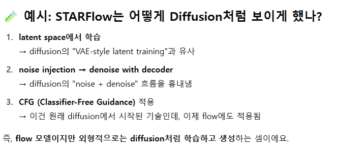 "Diffusion의 고품질 + Autoregressive의 효율성"을 정규화 흐름 기반으로 통합한 모델이 STARFlow입니다.