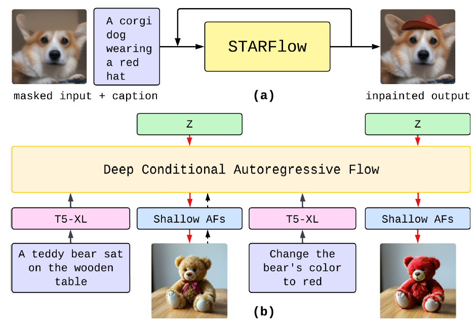 이러한 혁신을 통해, 우리는 NF 기반 모델이 대규모 고해상도 이미지 생성에 성공적으로 적용된 첫 사례를 제시합니다. 우리의 접근 방식은 기존 확산 기반 또는 오토레그레시브 기반 방법에 대한 확장 가능하고 효율적인 대안을 제공하며, 클래스 조건 이미지 생성과 대규모 텍스트-이미지 합성 모두에서 경쟁력 있는 성능을 보입니다. 또한, STARFlow는 매우 유연한 프레임워크로, 이미지 인페인팅(inpainting)이나 지시 기반 이미지 편집(instruction-based editing)과 같은 다양한 설정에도 간단한 파인튜닝을 통해 적용이 가능함을 실험을 통해 보여줍니다.