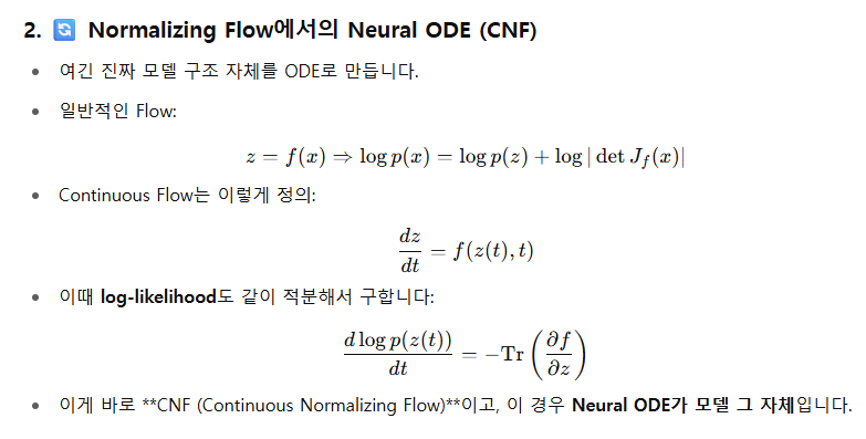 정규화 흐름(Normalizing Flows, NFs)는 연속 시간 모델(continuous-time)로 확장될 수 있으며, 이러한 확장 형태가 바로 연속 정규화 흐름(CNFs, Chen et al., 2018)입니다. CNF는 변환 과정을 상미분방정식(ODE)으로 모델링하며, 명시적인 가역 매핑을 요구하지 않으면서도 야코비안 계산을 trace 연산으로 단순화합니다 (Grathwohl et al., 2018). 다만, 이 경우 확률적 추정(stochastic estimator)이 필요하며 (Hutchinson, 1989), 노이즈로 인해 안정성 문제가 발생할 수 있습니다.