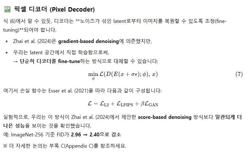 특히, ImageNet 256×256에서의 FID는 디코더 성능 한계에 거의 도달한 상태입니다 (자세한 내용은 부록 B 참고).
