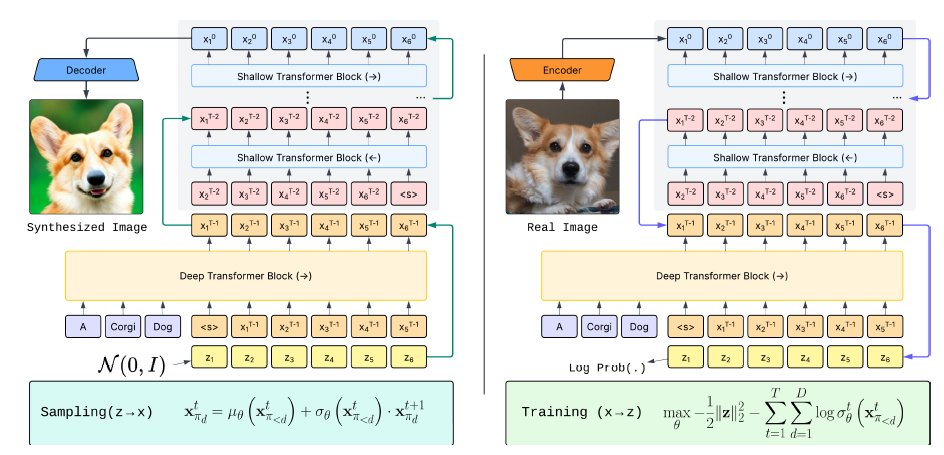 **"Transformer 기반 autoregressive flow로 diffusion을 대체하려는 시도"**죠.