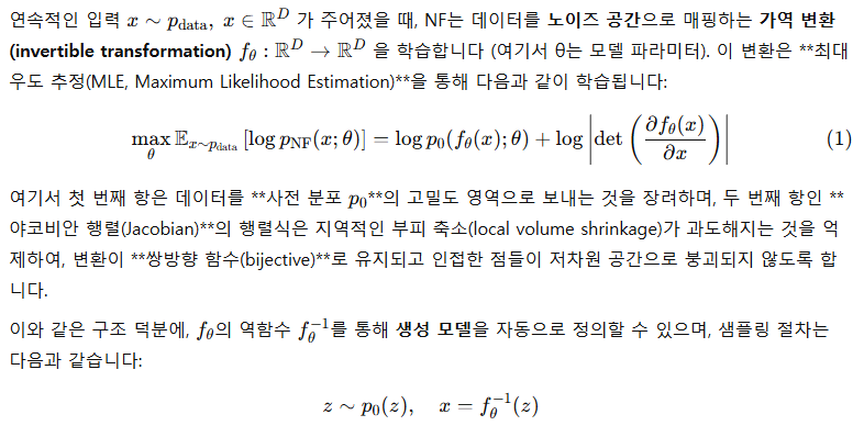 - NF는 생성과 우도 추정을 동시에 하기 위해, 입력 ↔ latent 공간 간의 가역 함수여야 함.