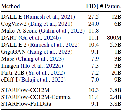또한, COCO에서의 제로샷 평가(Table 3)에서는 STARFlow가 텍스트 조건 생성에서 강력한 성능을 보이며, NF도 확장 가능하고 경쟁력 있는 생성 프레임워크가 될 수 있음을 시사합니다.
