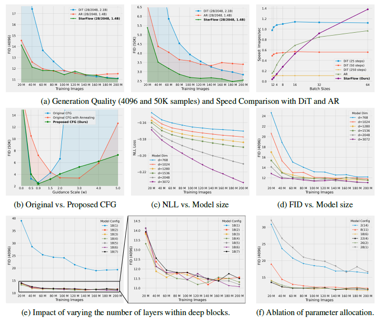 - 50,000개의 샘플로 평가하면 STARFlow가 모든 학습 체크포인트에서 가장 낮은 FID를 달성했습니다.