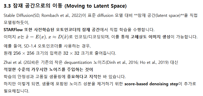 우리는 고해상도 이미지 합성에서 강력한 성능을 보이는, 정규화 흐름(normalizing flows)에 기반한 확장 가능한 생성 모델인 STARFlow를 소개한다. STARFlow의 핵심 구성 요소는 TARFlow(Transformer Autoregressive Flow)로, 이는 정규화 흐름과 Autoregressive Transformer 아키텍처를 결합한 구조이며 최근 이미지 모델링 분야에서 인상적인 성과를 보인 바 있다.