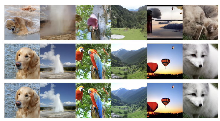 그림 3: 위에서 아래로, 8개의 flow 블록을 가진 TARFlow 모델에서 처음 0개, 3개, 8개의 flow 블록에 대해 guidance를 적용한 결과. 그림에서 알 수 있듯, guidance는 상위 3개의 블록까지만 효과적임을 확인할 수 있다.