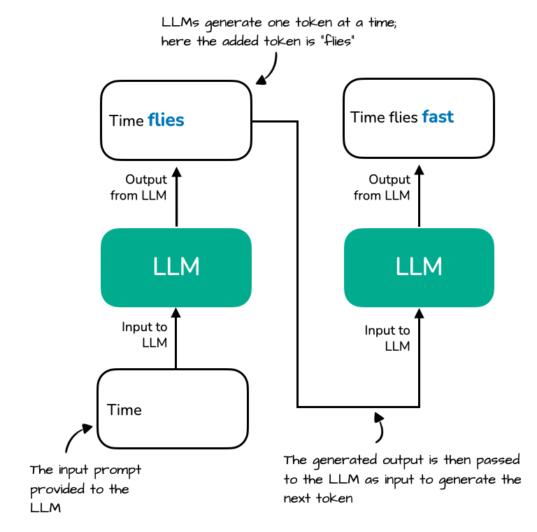 앞서 언급했듯이, LLM은 한 번에 하나의 토큰만 생성합니다. 예를 들어, 이전에 "fast"라는 단어가 생성되었다면 다음 프롬프트는 "Time flies fast"가 됩니다.