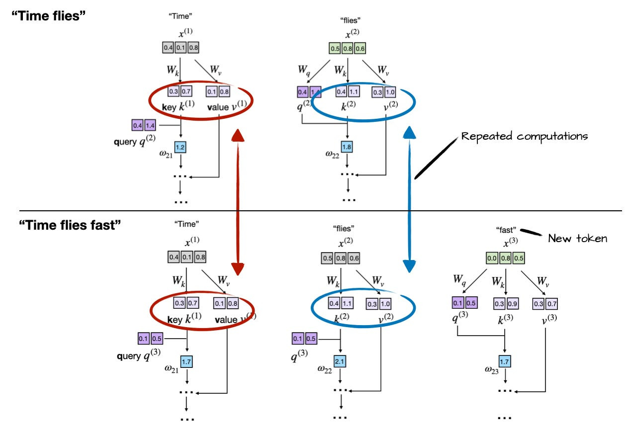 - 이후 새로운 토큰이 생성될 때마다 해당 토큰에 대해서만 key 및 value 벡터를 계산합니다.
