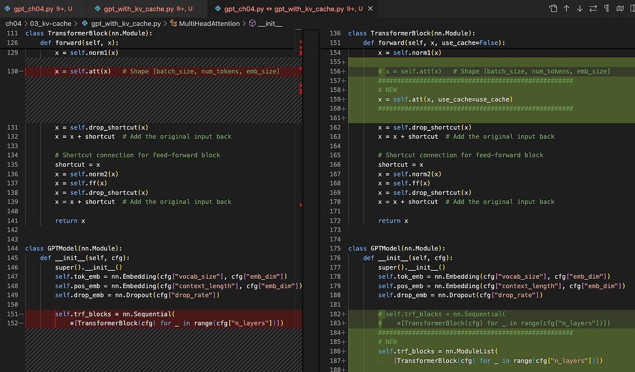- gpt_with_kv_cache.py: 위와 동일한 코드이지만, KV 캐시를 구현하기 위한 필수 변경사항이 적용된 버전입니다.